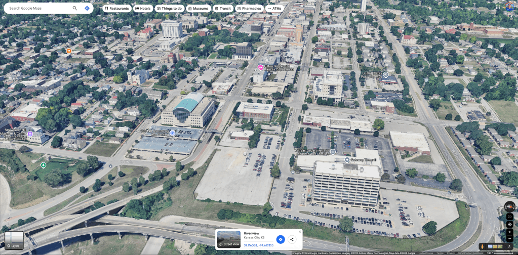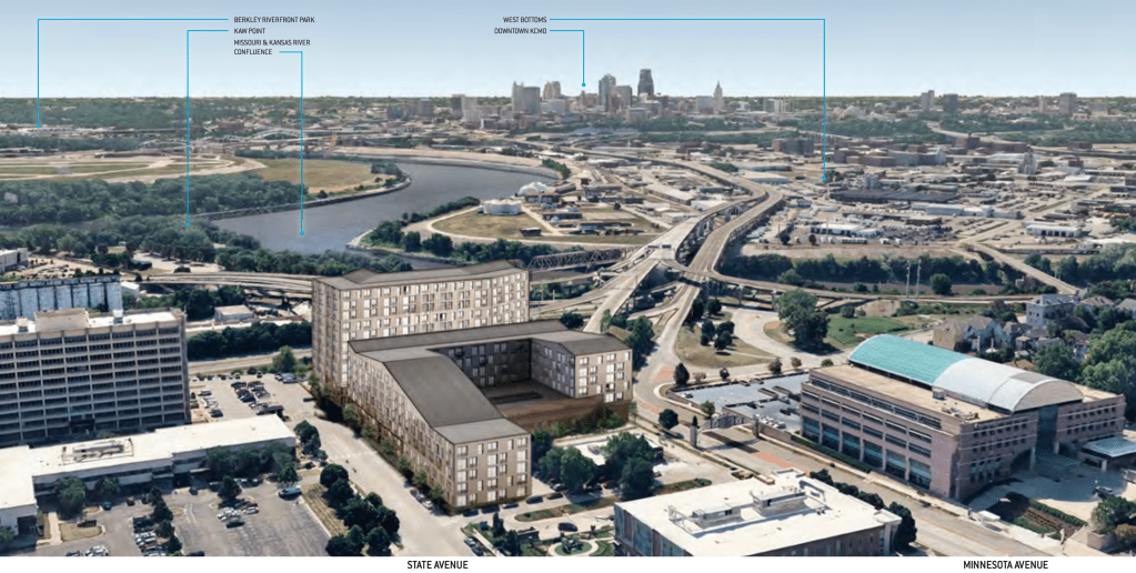 The first phase of the project is for a 12-story high-rise with 244 apartments looking out over the confluence of the Missouri and Kansas (Kaw) rivers, Kaw Point Park, the Wheeler Downtown Airport, and the Kansas City Missouri skyline and West Bottoms off to the right.