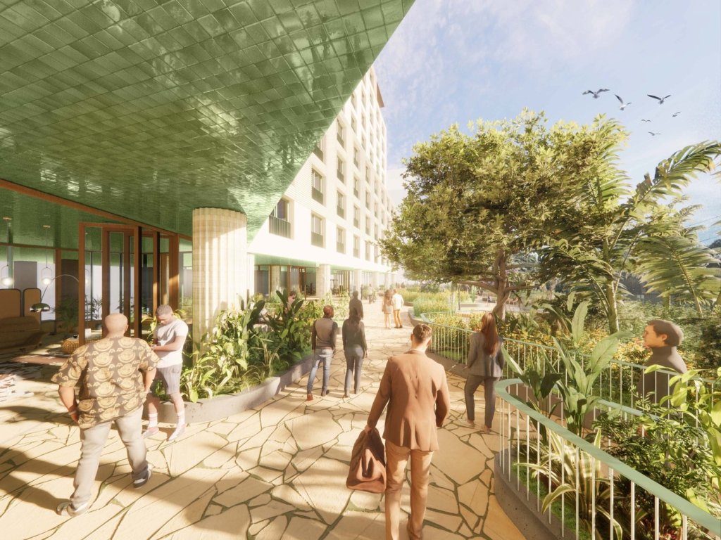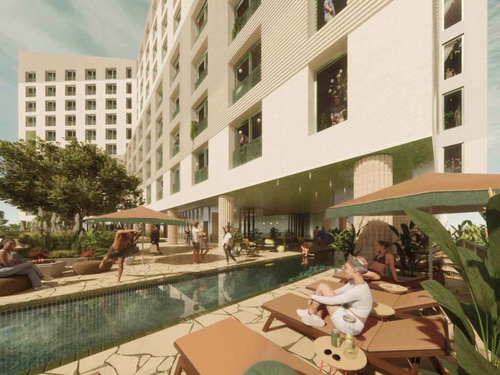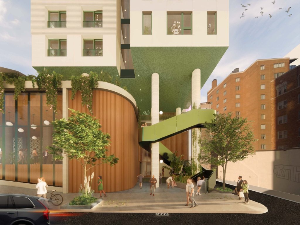 Thanks to the Ghadimi Group, a partner developer of the project, the renderings detail the building’s planned amenity decks and sidewalk interaction on 48th Street. Glazed green tiles accent the building’s light and gray colored brick facade. Sculpted pillars and swooping staircase rise from the ground along 48th Street. Lush landscaping is planned to beautify the amenity decks. Light green window frames and metal structures offer additional color accents to the modern building.