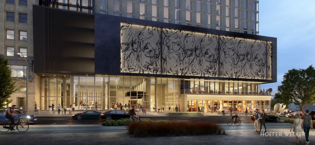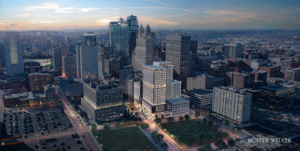 A development, planned by the BR Companies and designed by local architecture firm Hoefer Welker, will see a new 25-story tower rise into the sky. Clad in, what appears to be, a type of stone with windows and recessed balconies, the new tower breaks with the design style of the other new high-rises constructed in Downtown (all of which are in the Power and Light District and are clad entirely in glass).