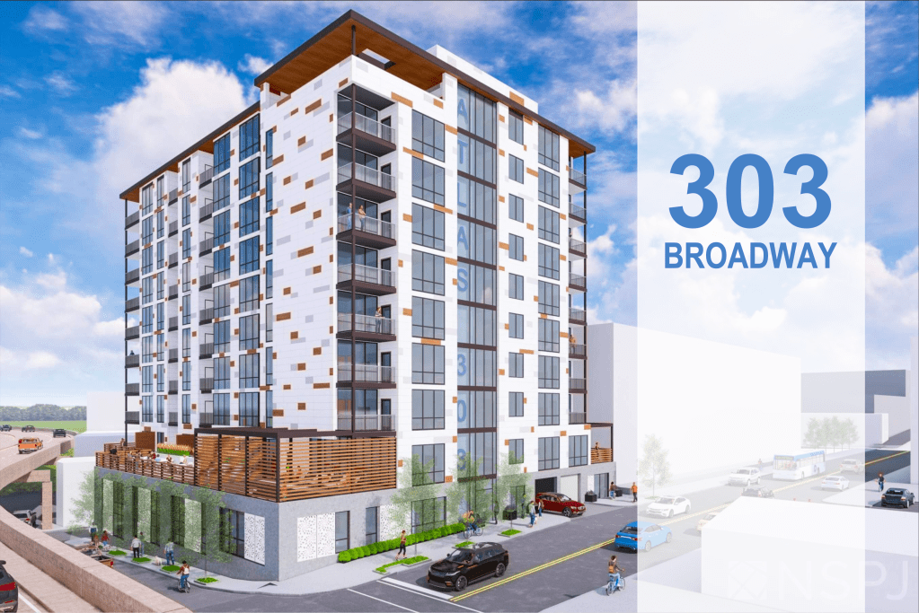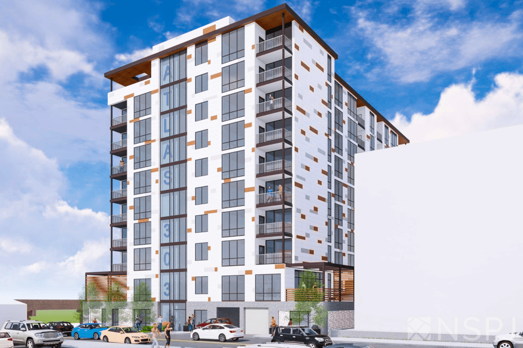 The developers of Atlas 303 are George Birt and Taylor McKee. They also developed the RM West apartments. NSPJ is the architect. The project replaces a vacant warehouse and associated small parking lot in the shadow of the new Buck O’Neil Bridge. It’s possible that we’ll see construction begin on this project this year.