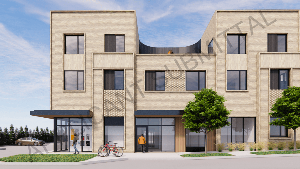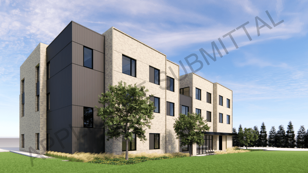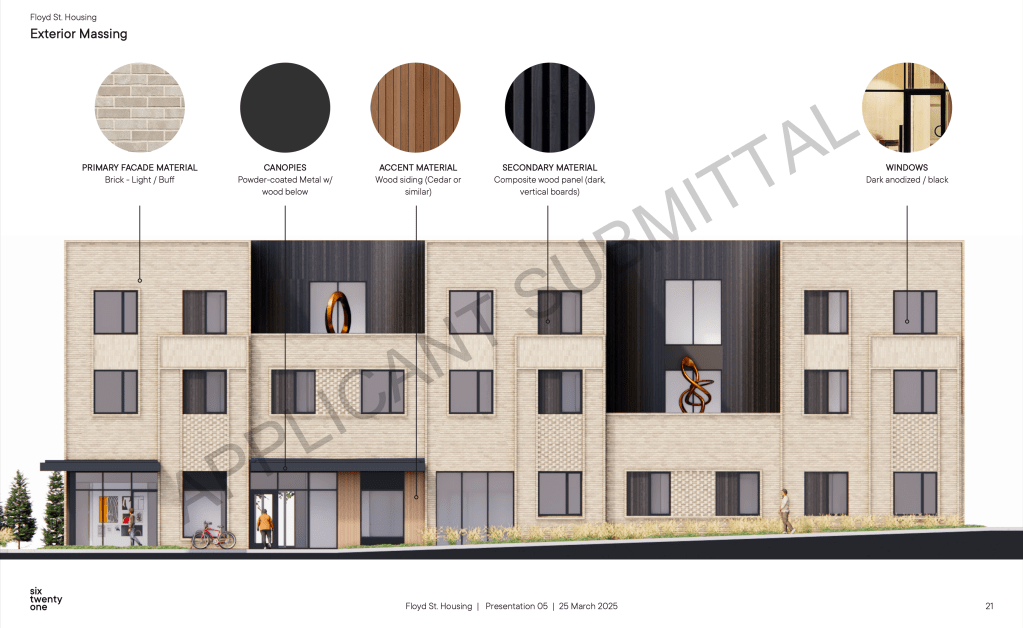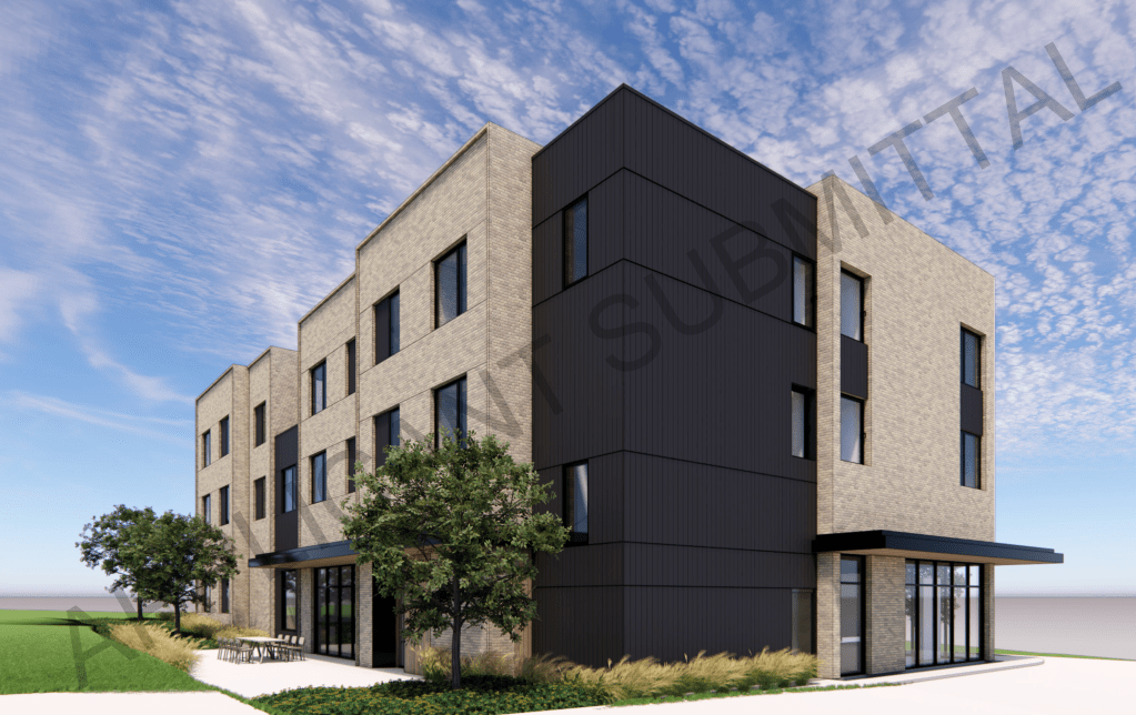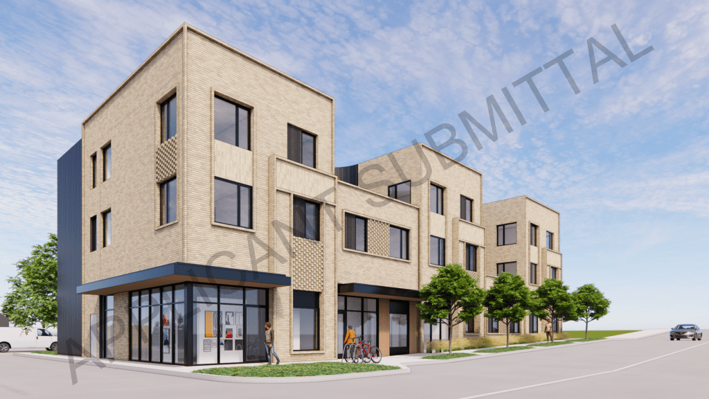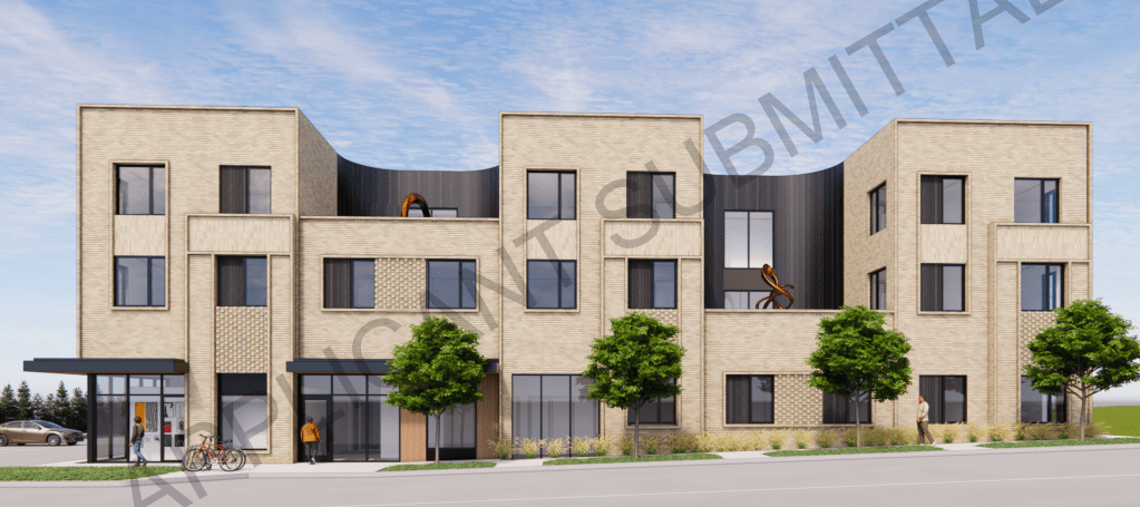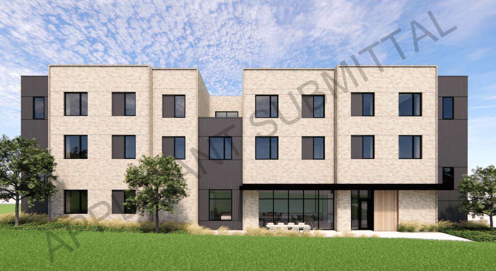 Proposed by “Friends of JCDS” (Johnson County Developmental Supports), the proposed building will rise 3-stories and include 17 apartments, a ground floor gallery space, and office for Friends of JCDS. A small parking lot will be built on the south side of the building. Design is by Kansas City-based SixTwentyOne Architects.