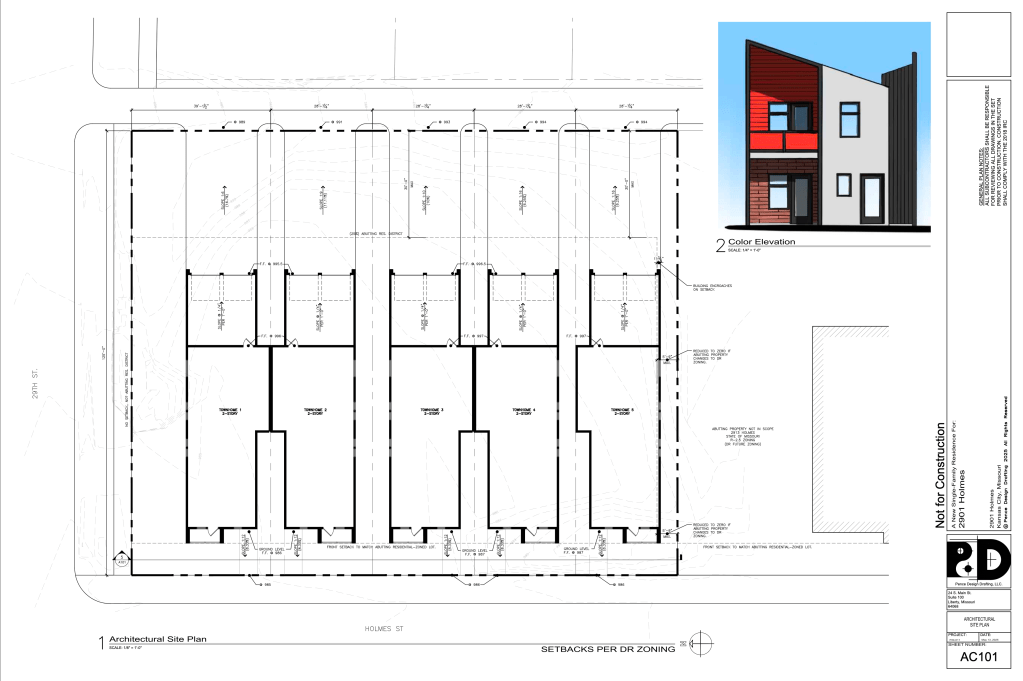 A recent application to CompassKC reveals a rezoning request from B4.5 and R-2.5 to Downtown Residential for the parcel located at 2901 Holmes. Plans uploaded to the application reveal 5, 2-story townhomes with a 2-car garage for each home accessed from the rear. The home designs are modern with a material legend they’ll be clad in a mixture of fiber cement panels and lab siding.