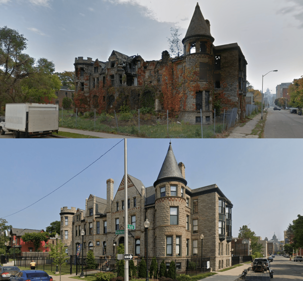 The neighborhoods near Downtown Detroit had long been a place where visitors would pass through to look at the grandeur of abandoned and collapsing mansions and homes. It reminded both Detroiters and visitors about a time when Detroit was both an industrial powerhouse and the richest City in the United States. The automobile, which built Detroit and gave it the nickname “Motor City” was one of the many causes that led to its downfall with residents fleeing for the suburbs and roads needing to be widened all the while the urban core continued to lose population. These grand mansions would eventually go vacant and end up collapsing or burning down. As a result, many have been lost, but some have been saved.