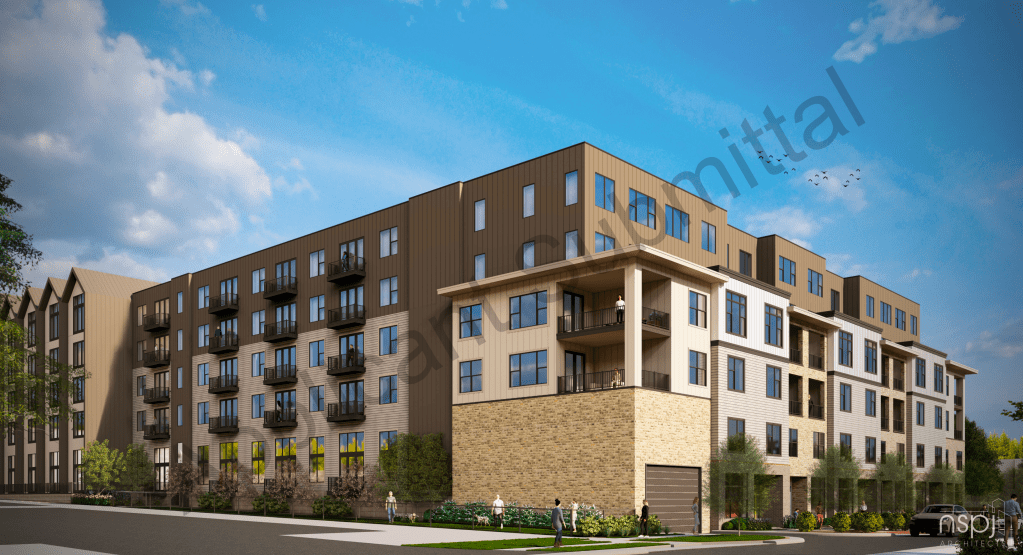 Currently home to a mid-century commercial building (which once housed a funeral home), and just north of Jimmy John’s, a proposal for a 5-story, 198-unit apartment building was submitted to the City of Overland Park on January 14th. The project also includes around 7400sf of retail space fronting Metcalf, a 277 space parking garage, and 6, 3-bedroom townhouse style units fronting Travis Street. The building will be clad in a mixture or brick, stone, and composite panels. The parking entrance will be on 82nd Street and a move-in zone will be accessed from Travis Street.