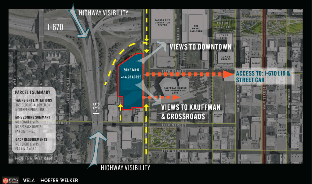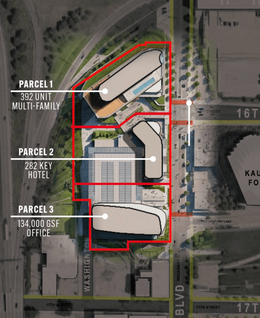 In February, I wrote about the 32-story apartment tower that’s planned by EPC Real Estate, VeLa Development, and Dan Carr at 1650 Broadway, which is just west of the Kauffman Center. At the time, we knew that the tower was just the first phase of a larger project that would take up the properties between Los Tules restaurant on the south the Broadway exit ramp from 35 North on the north. The tower was revealed as part of an informational presentation of the project to the public with PortKC intending to induce the issuance of bonds later this year.