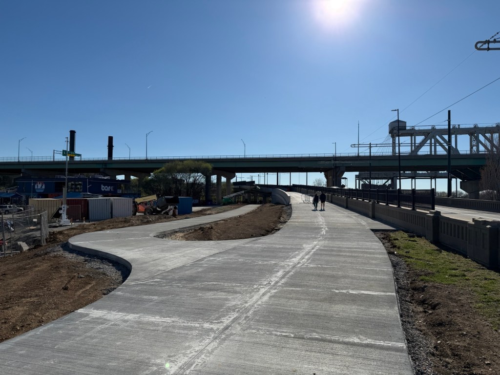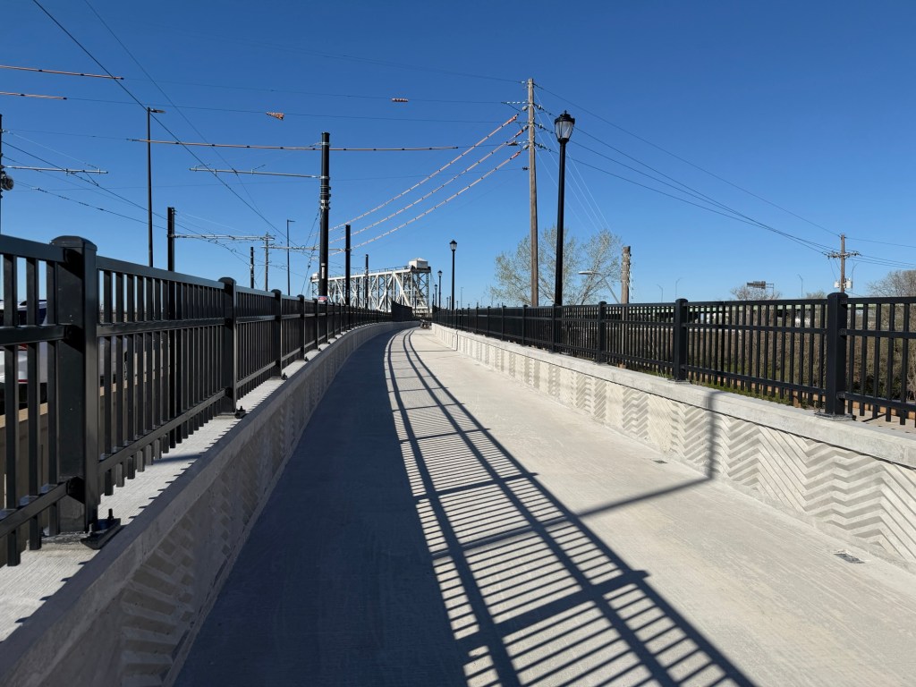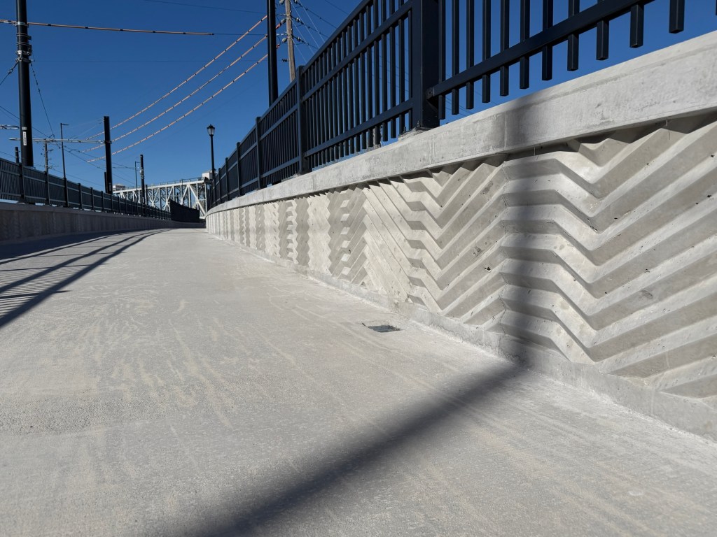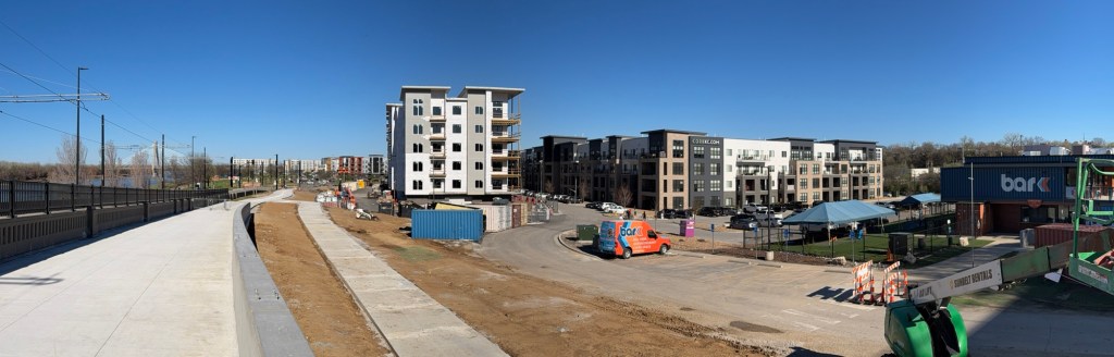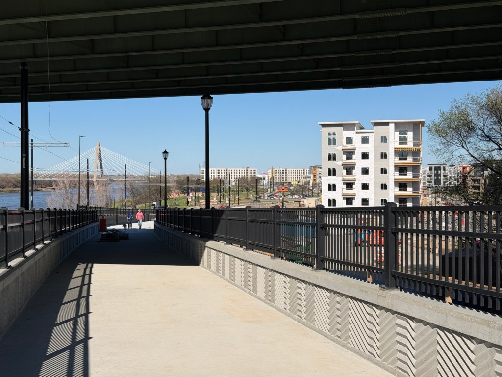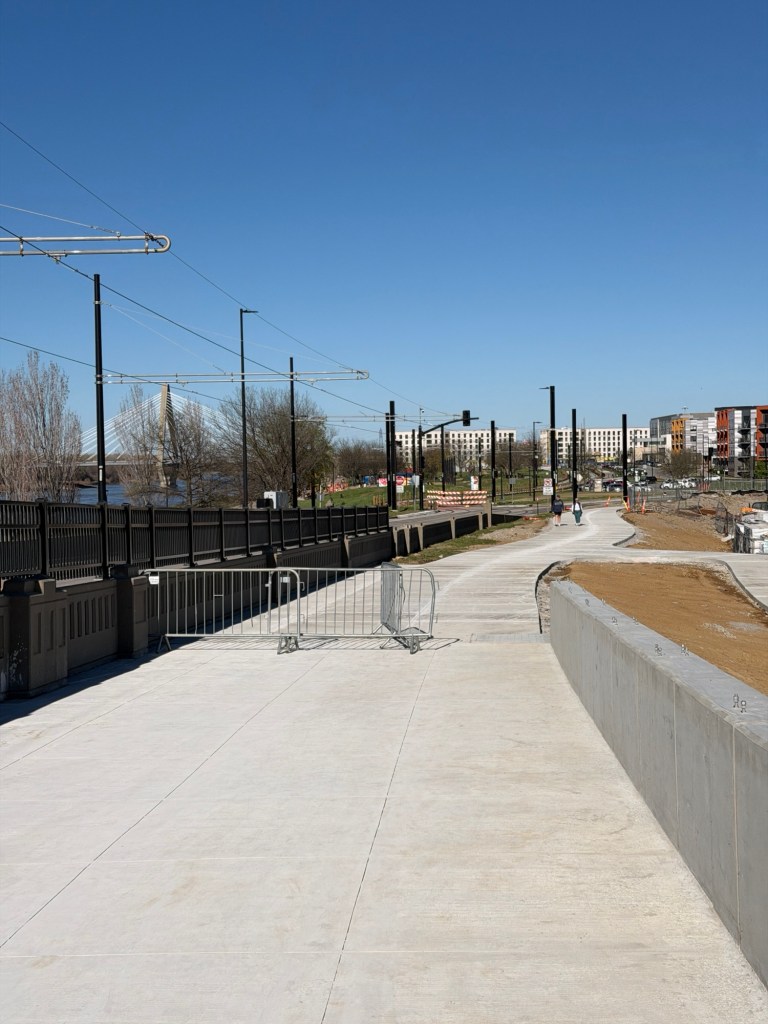 A few weeks back, the fences were peeled back on the Riverfront Pedestrian Bridge, which runs parallel to Grand from 2nd Street to where Grand turns into Berkley Parkway in front of Core Phase 2. From my walk on it, it’s a 5 minute walk from 2nd and Grand to Core Phase 2 and is the more direct pedestrian route than the existing Town of Kansas Bridge and Riverfront Trail that so many have utilized. The new bridge will open up in the coming weeks and, besides being a shortcut for pedestrians to get to and from Berkley Park, it offers a safer alternative than walking and biking on the shoulders of the Grand bridge (something that’s extremely dangerous now thanks to narrow clearances due to the Streetcar).